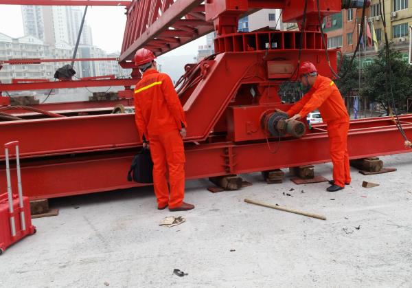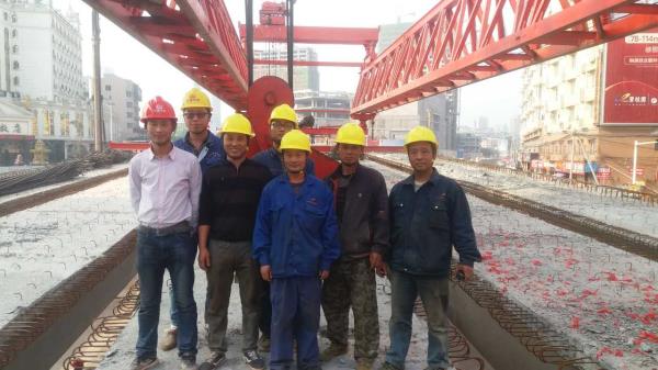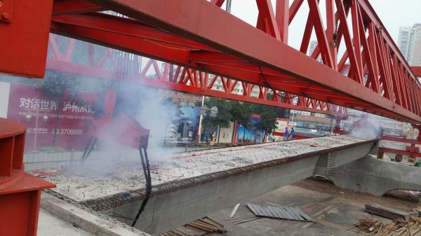 本项目由中铁二局五公司施工,北岸高架桥共有11跨55片30米箱梁,桥式布置为大里程5跨和小里程6跨,中间有3跨钢箱梁相隔。北岸高架桥位于泸州市蜀泸大道上,桥纵坡最高达到6%,架设难度大、车流量大、施工干扰大。由于工期紧、任务重,中途还需拆拼架桥机一次。接到进场通知后,公司派出一名副总经理到现场蹲点指挥,抽调云南贵州项目多名起重工赶赴现场,在三天内完成了架桥机的拼装和试吊工作,进入了抢工大战状态。在架梁过程中,全体参战人员始终将安全和质量放在首位,严格执行经理部下达的架梁方案和运梁方案,倒排工期,合理组织,每孔架梁前对桥机和炮车都进行了仔细检查,及时排除故障,确保了设备正常运行。施工中大家齐心协力,发扬团结务实的企业精神和追求卓越、勇于跨越的企业作风 ,抢雨天、战晴天,在业主规定的节点工期内按时完成了架梁任务,为后续桥面系施工赢得了宝贵时间,为全桥顺利完工奠定了坚实的基础。