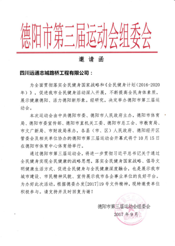 9月15日,公司收到德阳市第三届运动会组织委员会的邀请函,诚邀公司参加此次运动会开幕仪式。收到邀请函后,公司积极响应并安排专人负责与组委会相关部门及人员商谈我公司人员参会事宜、公司宣传事宜和传递相关资料事宜。