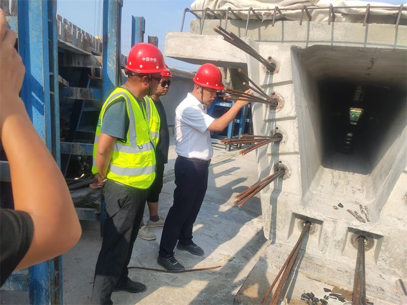 您的当前位置:首页 > 新闻中心 > 公司新闻 7月26日上午,由公司许全实董事长带队,组织项目负责人及工程技术人员到雄白项目进行了例行检查。 许全实董事长首先听取了项目负责人黄道付对梁场的整体规划、工程概况等情况介绍。随后,又参观了箱梁预制区、装配式预制区和存梁区,以及对现场文明施工、标准化管理、工程施工质量等进行了检查。重点检查了箱梁预制施工保护层控制,从钢筋胎具制作,到钢筋加工及绑扎,严格按设计图纸控制各部位尺寸。过程中抽查钢筋...