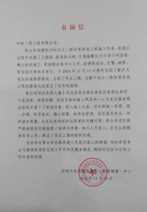 近日,公司承担的中铁二局五公司泸州沱江二桥架梁项目按时兑现了节点工期,受到泸州市政府投资建设工程管理中心的表扬。公司对泸州项目参战员工进行了通报表扬,并号召其他项目学习和发扬泸州架梁精神,精心组织,规范操作,积极主动与项目部协调配合,为甲方和公司争创荣誉。